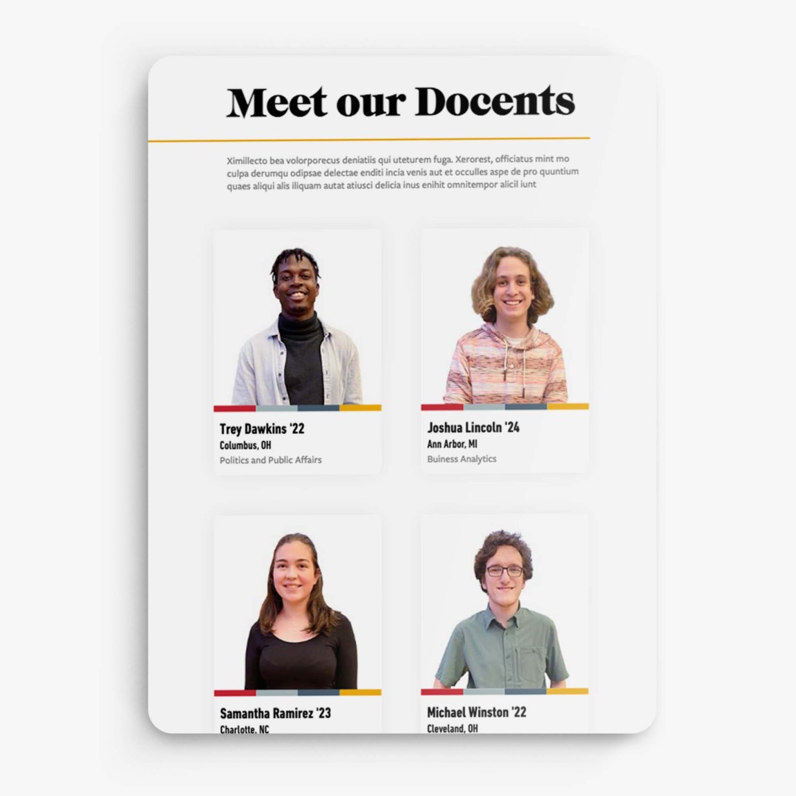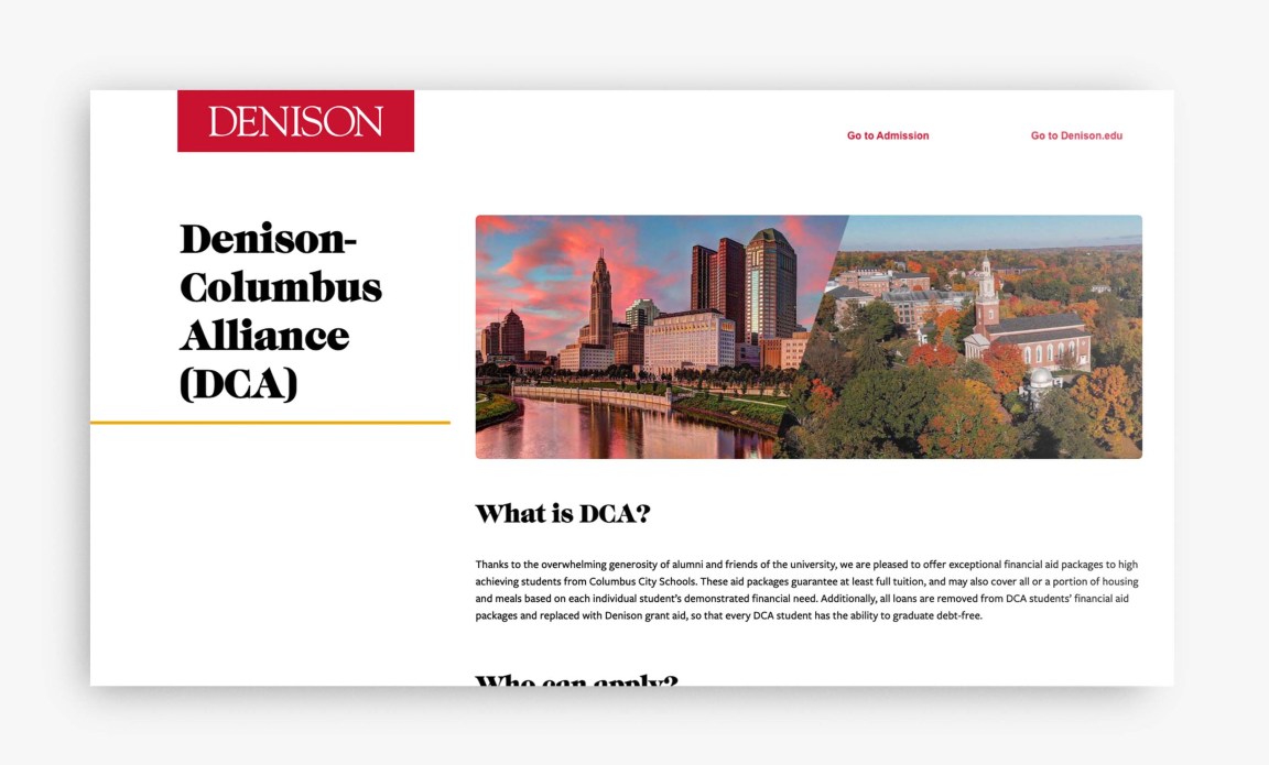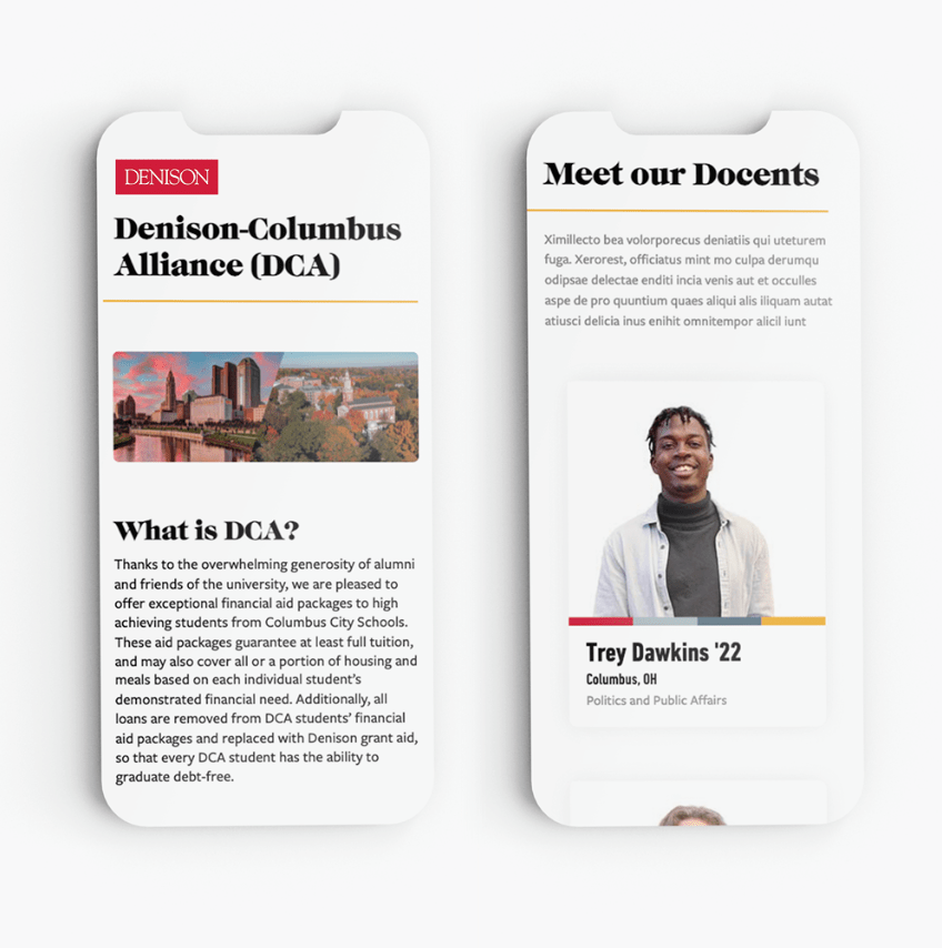 My fluency in HTML and CSS allows me to not only communicate effectively with developers, but also to hold my own when tasked with deploying landing pages from scratch. Many of the web pages I created for Denison are for specific campus events that will be emailed directly to high school counselors. Additionally, I was able to create a “Meet the Staff” page for our student employees (referred to as “docents”) with a reusable template that I made with the purpose of being user friendly and reusable.